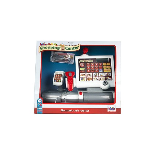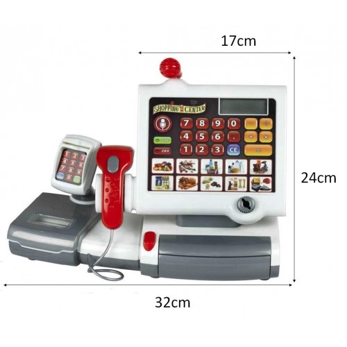 Setul include o casă de marcat cu: un scanner, cântar, ecran, slot card credit, buzunar pentru monede, bani de jucărie și microfon.