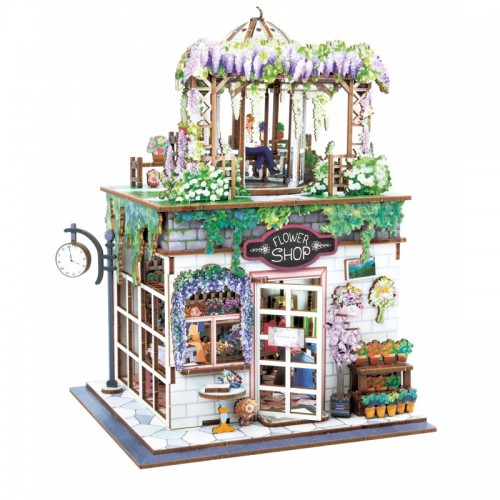 Asamblați piesele din lemn și construiți-vă propria florărie în miniatură. Lipiți și așezați mobilierul, accesoriile, plantele și florile pentru a recrea atmosfera confortabilă a unei florării.