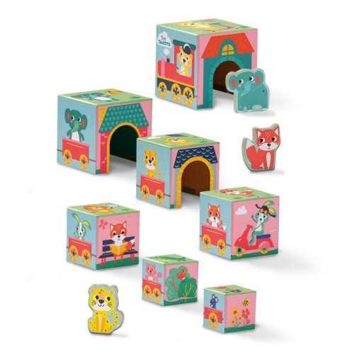 Conţinut: 7 cutii deschise pentru stivuire, de dimensiuni diferite; 3 figurine din lemn (leopard, elefant şi vulpiţa)