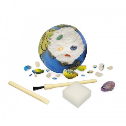 Include: Globul Pământesc din ipsos, 6 pietre, daltă, pensulă, burete și instrucțiuni colorate.