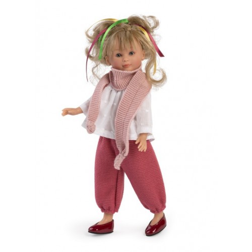 Papusa Celia cu pantaloni rosii si camasa alba 30 cm.