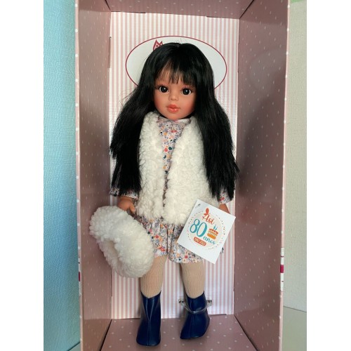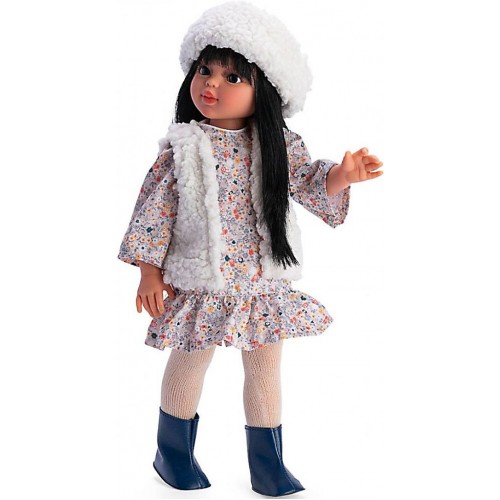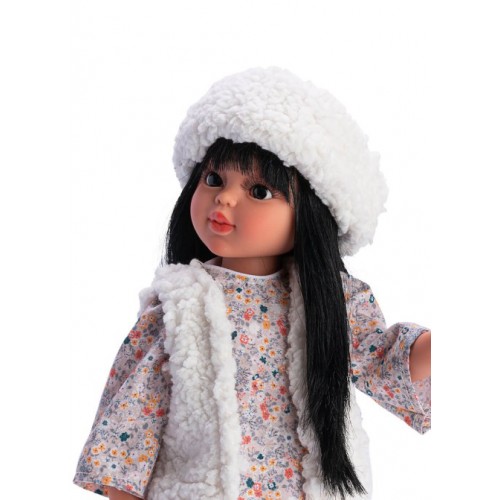 Papusa Sabrina bruneta cu vesta si caciulita alba 40 cm