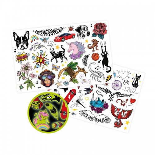 Sunt incluse și 4 foi de tatuaje temporare pentru tatuaje colorate, care strălucesc în întuneric.