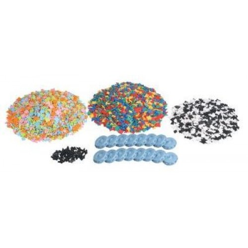Culorile pieselor: rosu, roz, galben, portocaliu, albastru, albastru deschis, verde, verde deschis, alb si negru