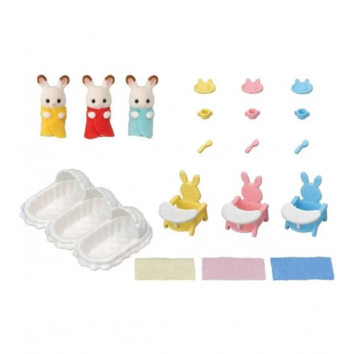 Sylvanian Families-Set De Ingrijire A Iepurasilor Tripleti este format din cei trei frati gemeni: Flora, Fauna si Philip Chocolate Rabbit; 1 patut triplu pentru bebelusi; 3 scaune inalte pentru luat masa; 3 cani; 3 farfurii; 3 linguri.